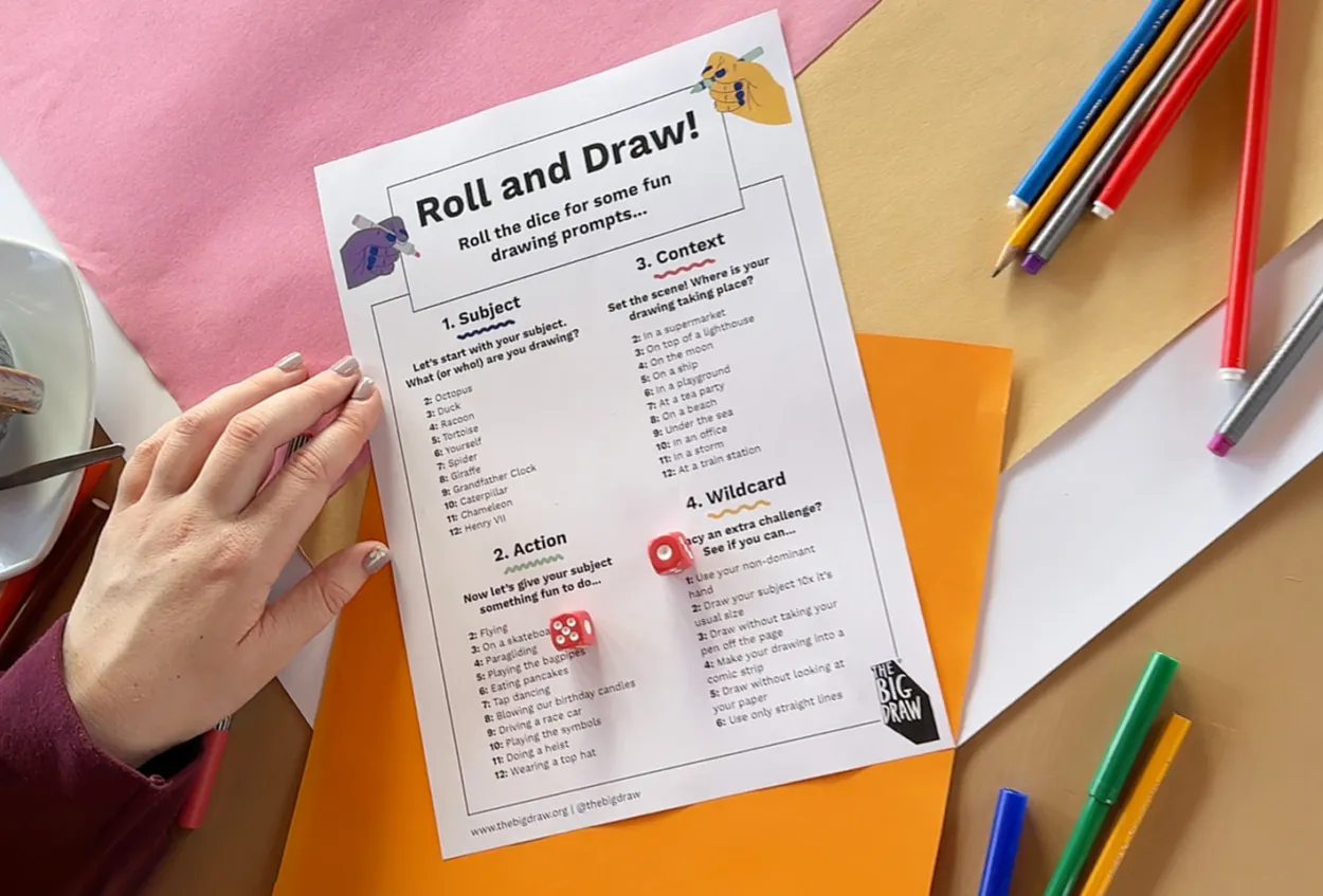 We’ve created a dice-based drawing game with prompts designed to make drawing fun, light-hearted - and somewhat unpredictable. Instead of scrolling for inspiration or waiting for an idea to arrive, simply roll the dice and see what hilarious or unlikely scenario you have to create! These prompts work for kids and adults alike, and they're really just about helping you to warm-up and play. Because drawing really isn't that serious! And sometimes the hardest part is just getting started.